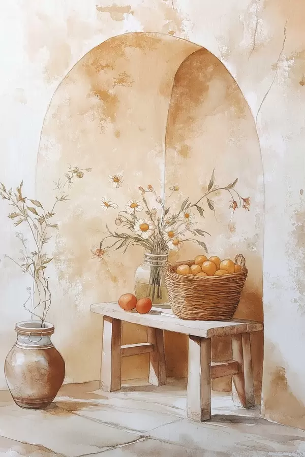 Poster Arco de pared con jarra antigua, flores de manzanilla y cesta de naranjas Nr f44613
