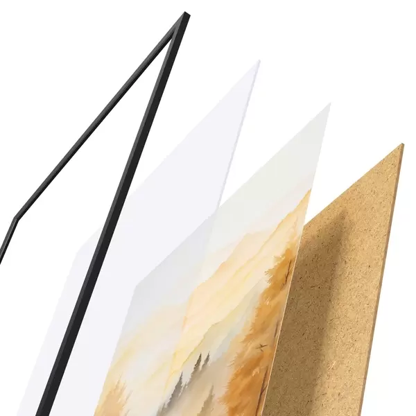 El póster consta de marco, plexiglás, imagen impresa y soporte de aglomerado. El póster puede colgarse inmediatamente en la pared gracias a los soportes de la parte posterior.