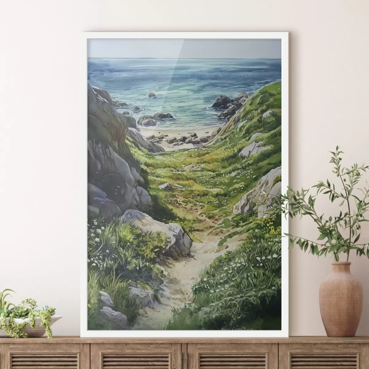 Poster Costa marina con rocas y hierba verde, estilo acuarela, verano Nr f44616