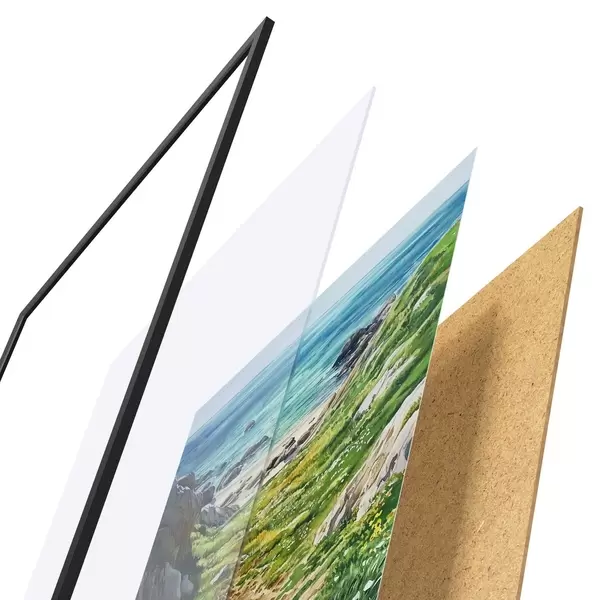 El póster consta de marco, plexiglás, imagen impresa y soporte de aglomerado. El póster puede colgarse inmediatamente en la pared gracias a los soportes de la parte posterior.