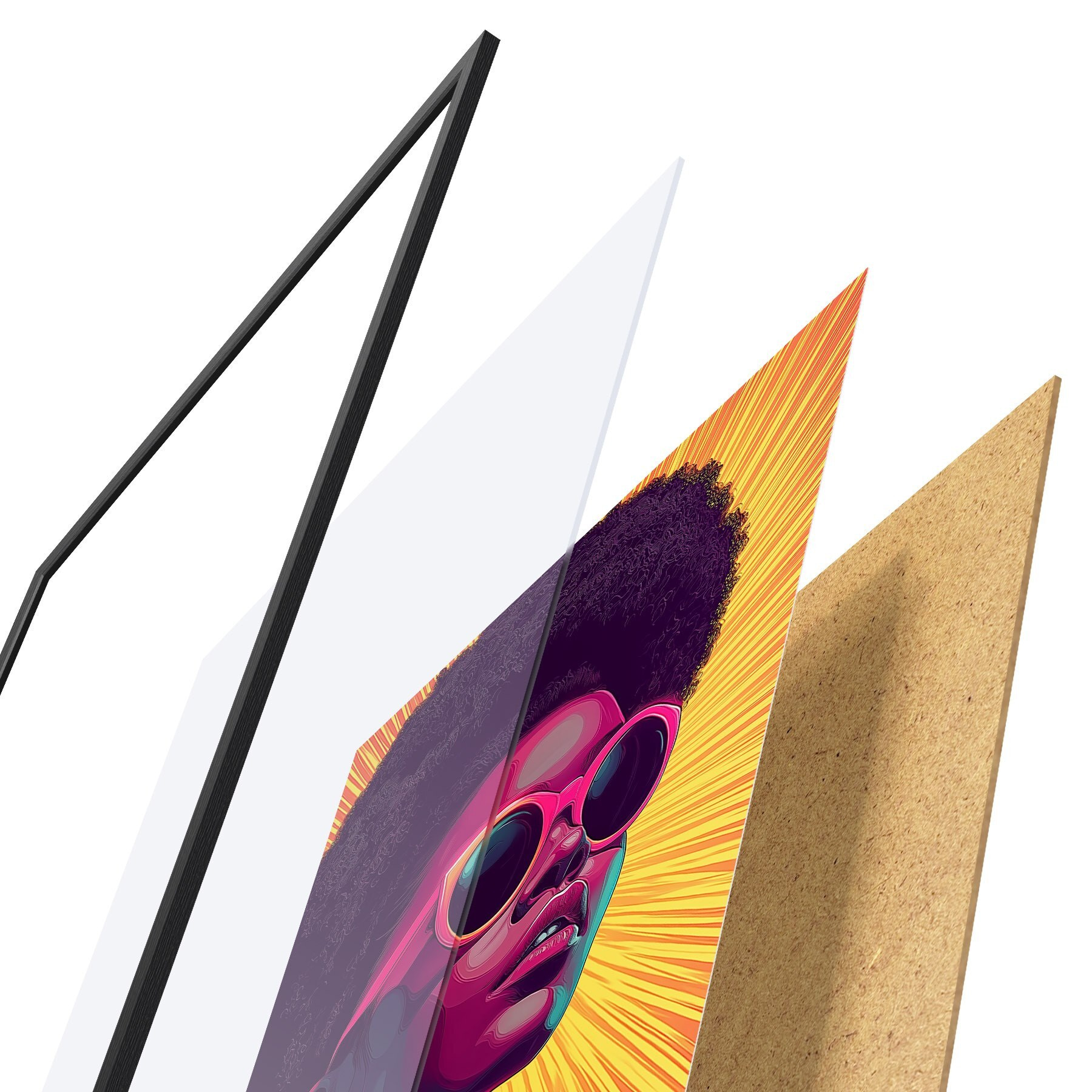 El póster consta de marco, plexiglás, imagen impresa y soporte de aglomerado. El póster puede colgarse inmediatamente en la pared gracias a los soportes de la parte posterior.