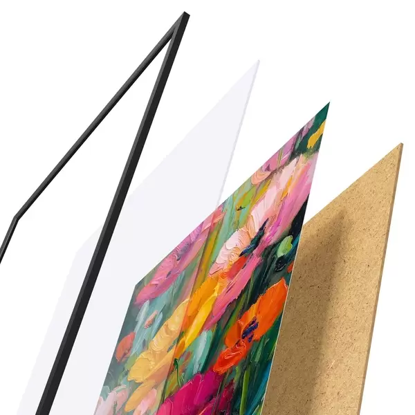 El póster consta de marco, plexiglás, imagen impresa y soporte de aglomerado. El póster puede colgarse inmediatamente en la pared gracias a los soportes de la parte posterior.