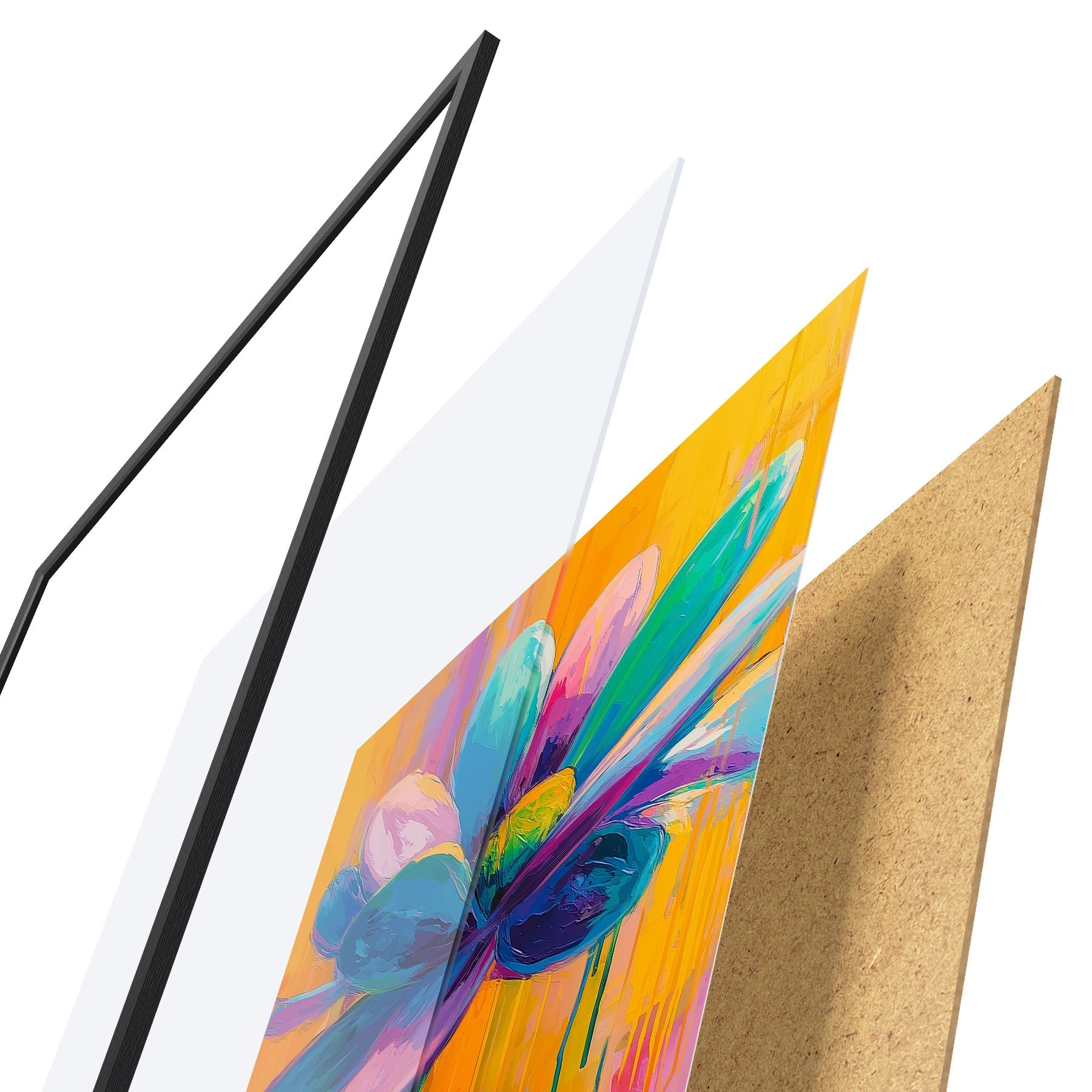 El póster consta de marco, plexiglás, imagen impresa y soporte de aglomerado. El póster puede colgarse inmediatamente en la pared gracias a los soportes de la parte posterior.
