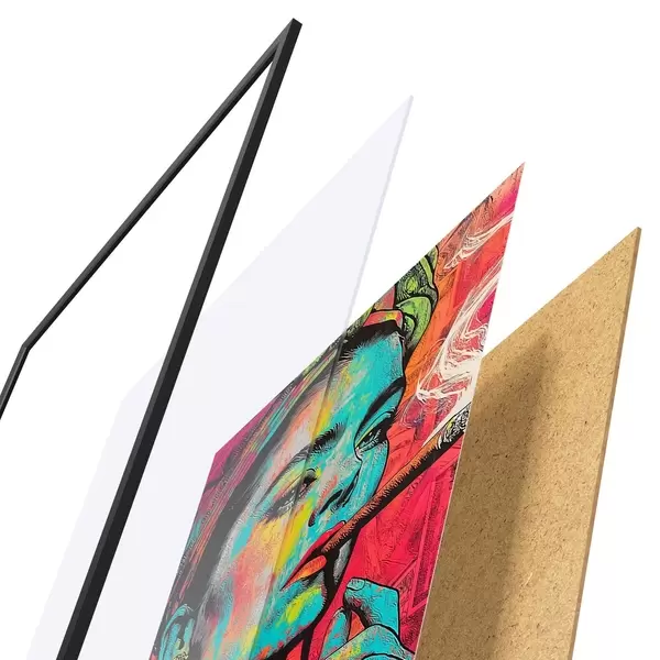 El póster consta de marco, plexiglás, imagen impresa y soporte de aglomerado. El póster puede colgarse inmediatamente en la pared gracias a los soportes de la parte posterior.