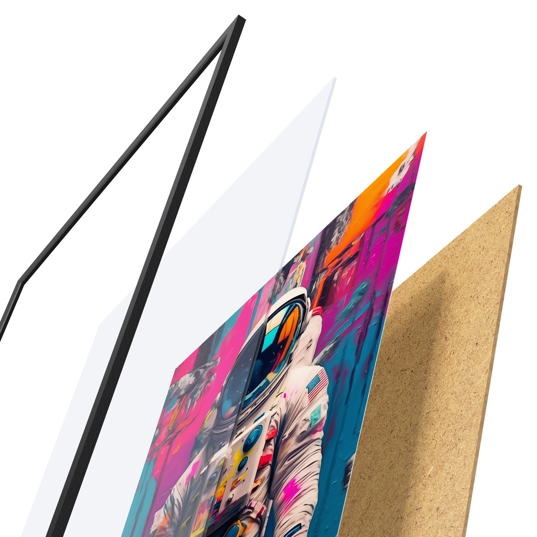 El póster consta de marco, plexiglás, imagen impresa y soporte de aglomerado. El póster puede colgarse inmediatamente en la pared gracias a los soportes de la parte posterior.