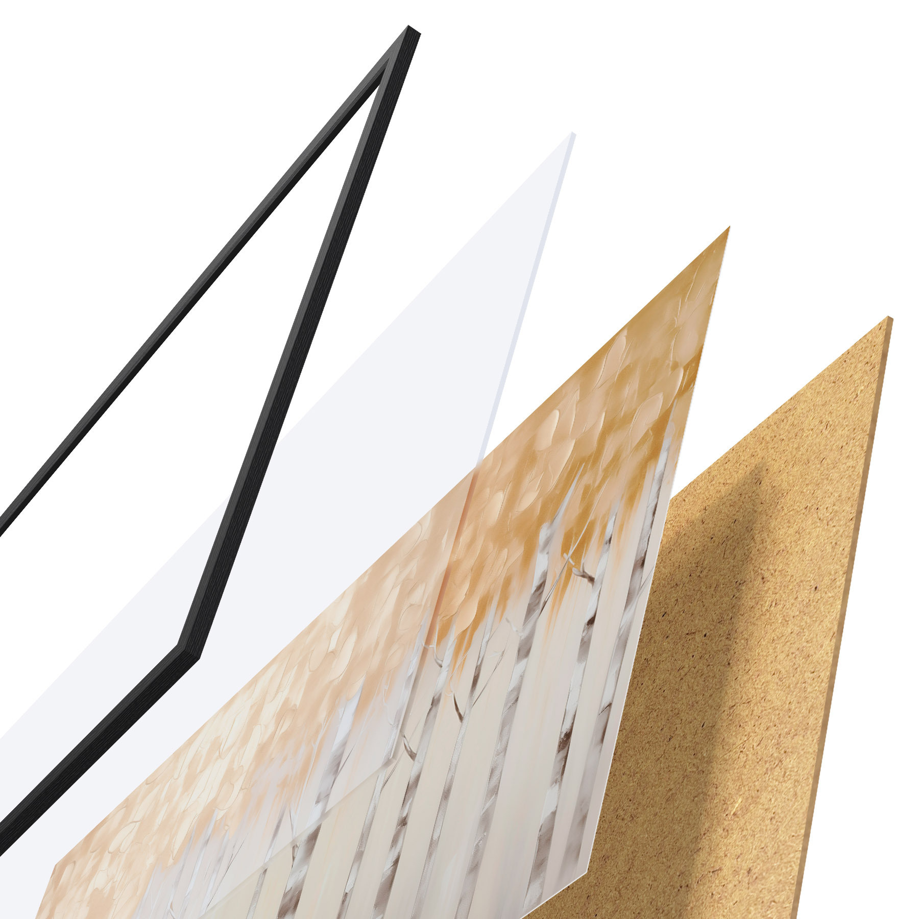 El póster consta de marco, plexiglás, imagen impresa y soporte de aglomerado. El póster puede colgarse inmediatamente en la pared gracias a los soportes de la parte posterior.