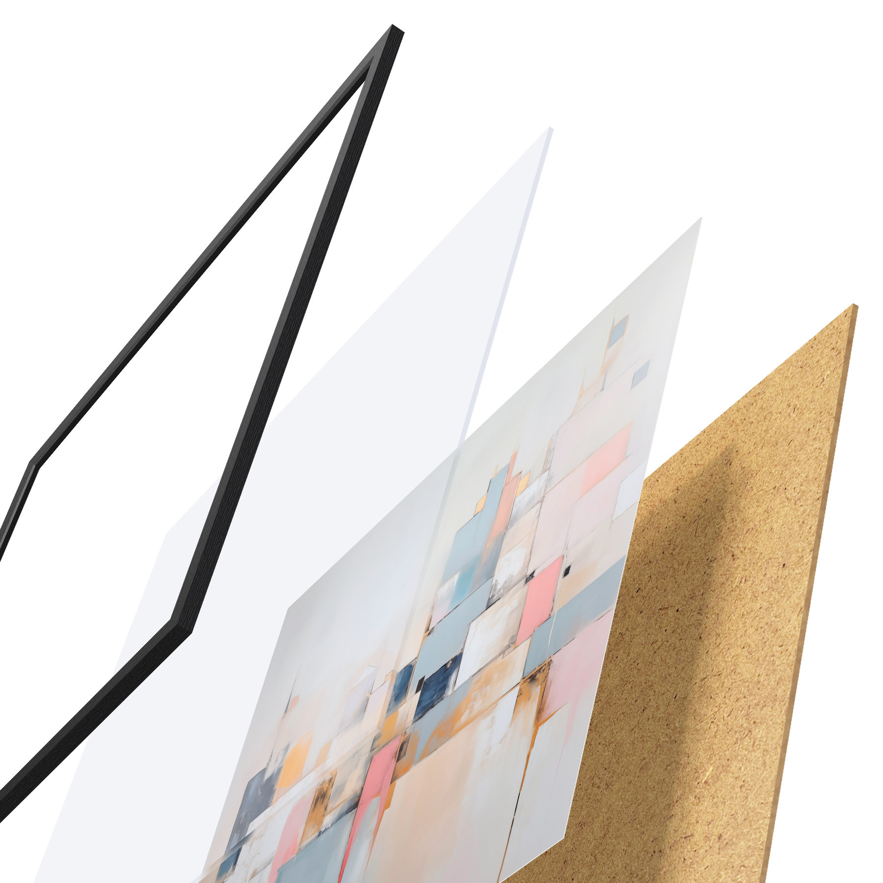 El póster consta de marco, plexiglás, imagen impresa y soporte de aglomerado. El póster puede colgarse inmediatamente en la pared gracias a los soportes de la parte posterior.