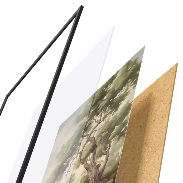 El póster consta de marco, plexiglás, imagen impresa y soporte de aglomerado. El póster puede colgarse inmediatamente en la pared gracias a los soportes de la parte posterior.