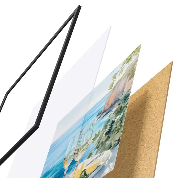 El póster consta de marco, plexiglás, imagen impresa y soporte de aglomerado. El póster puede colgarse inmediatamente en la pared gracias a los soportes de la parte posterior.