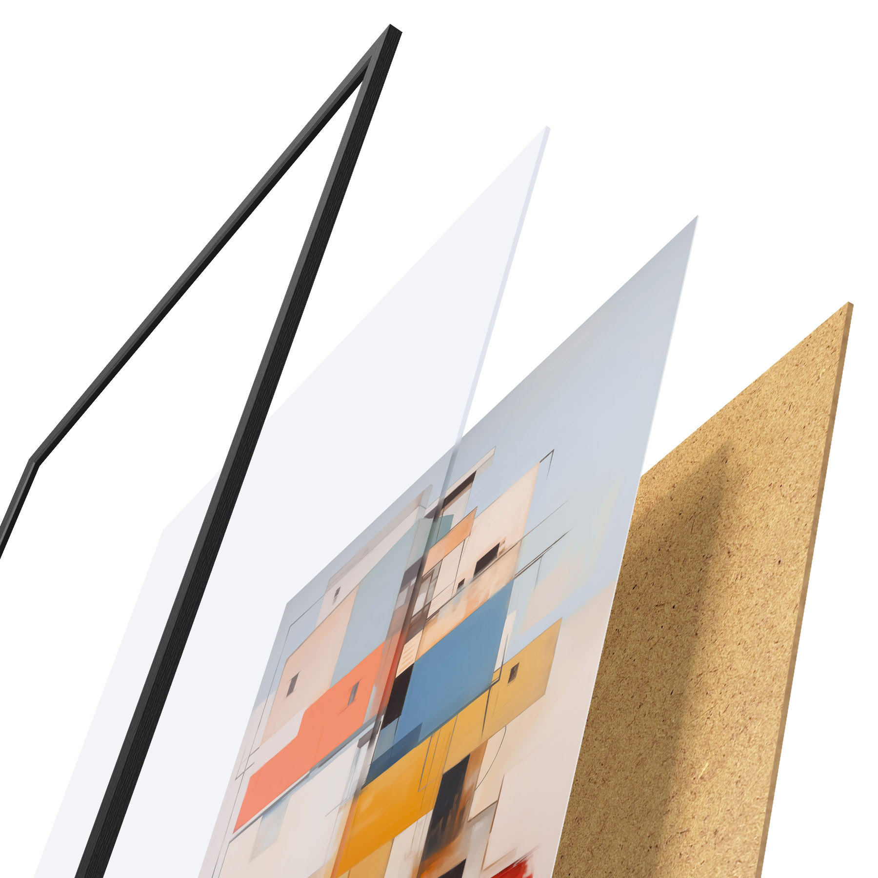 El póster consta de marco, plexiglás, imagen impresa y soporte de aglomerado. El póster puede colgarse inmediatamente en la pared gracias a los soportes de la parte posterior.