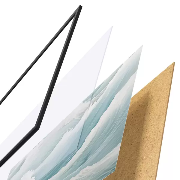 El póster consta de marco, plexiglás, imagen impresa y soporte de aglomerado. El póster puede colgarse inmediatamente en la pared gracias a los soportes de la parte posterior.
