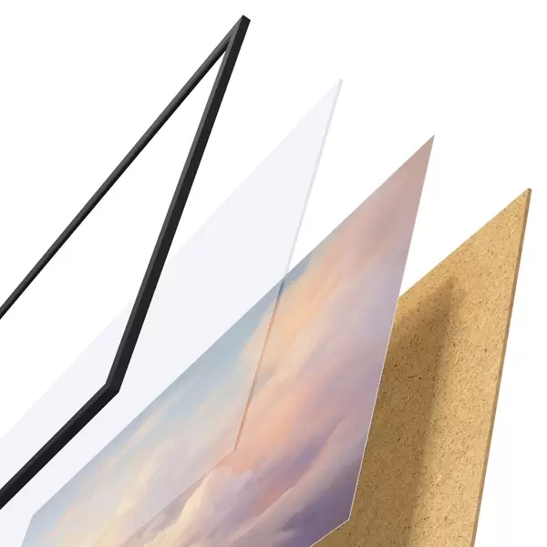El póster consta de marco, plexiglás, imagen impresa y soporte de aglomerado. El póster puede colgarse inmediatamente en la pared gracias a los soportes de la parte posterior.
