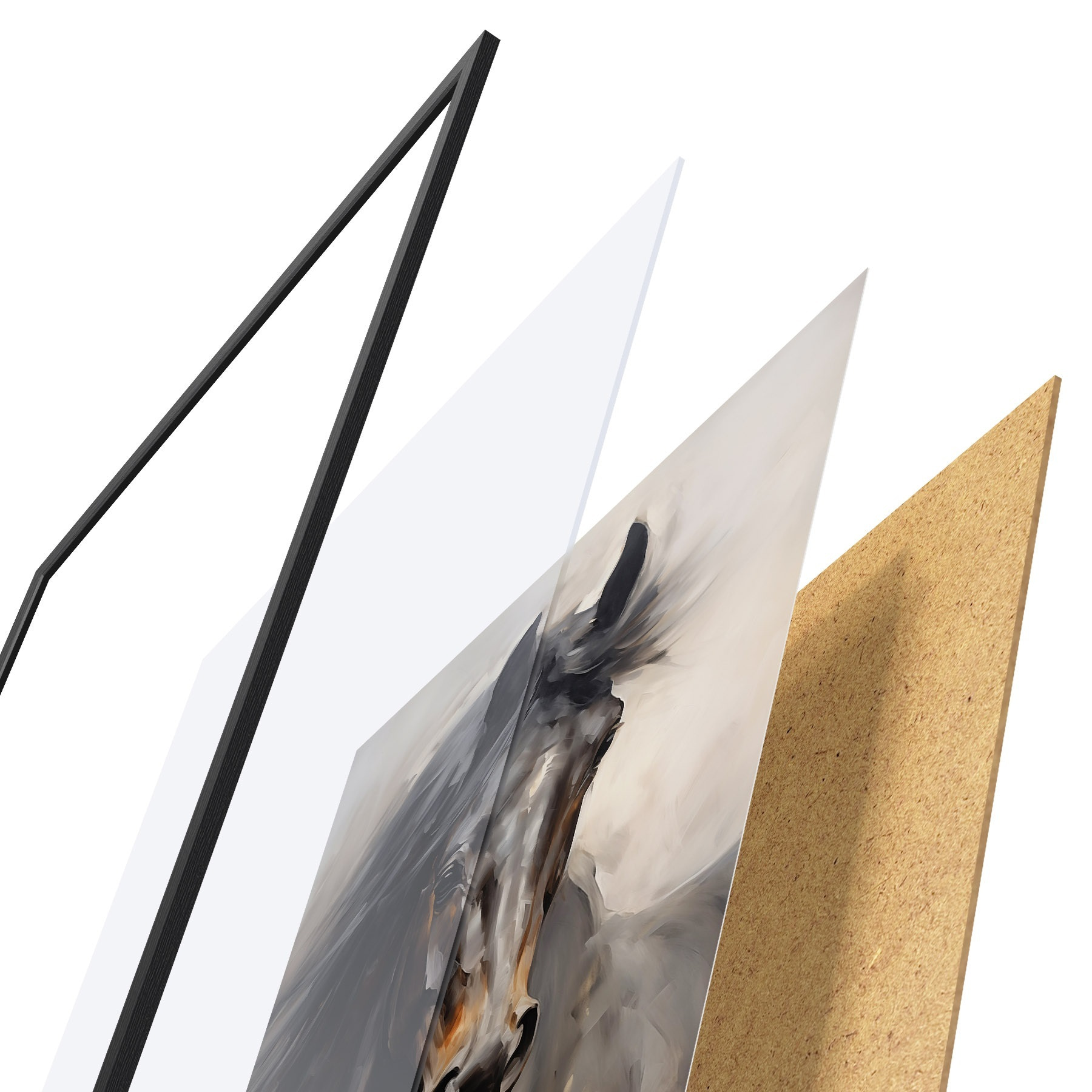 El póster consta de marco, plexiglás, imagen impresa y soporte de aglomerado. El póster puede colgarse inmediatamente en la pared gracias a los soportes de la parte posterior.