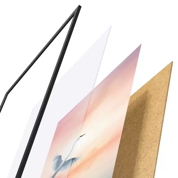 El póster consta de marco, plexiglás, imagen impresa y soporte de aglomerado. El póster puede colgarse inmediatamente en la pared gracias a los soportes de la parte posterior.