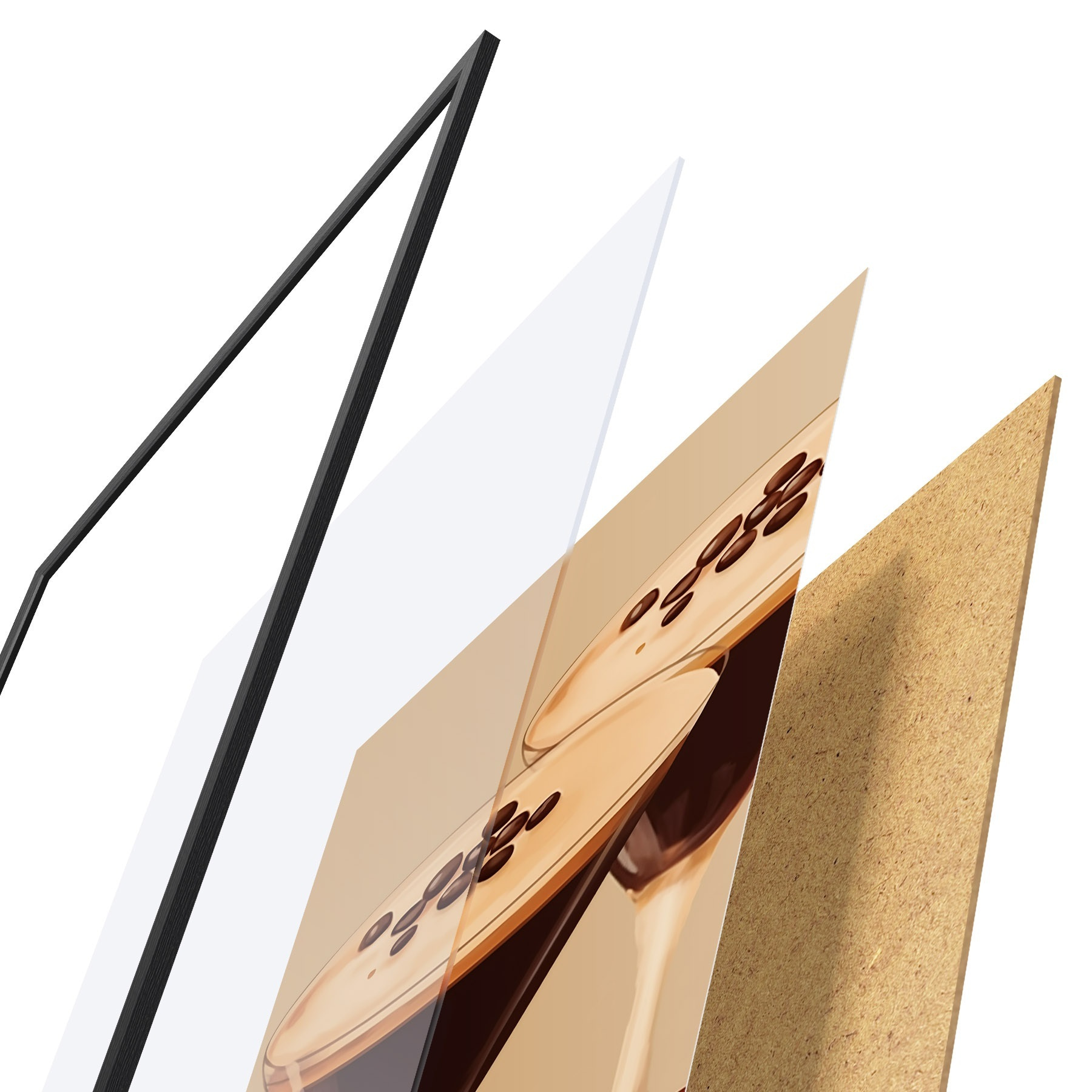El póster consta de marco, plexiglás, imagen impresa y soporte de aglomerado. El póster puede colgarse inmediatamente en la pared gracias a los soportes de la parte posterior.