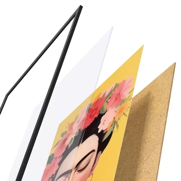 El póster consta de marco, plexiglás, imagen impresa y soporte de aglomerado. El póster puede colgarse inmediatamente en la pared gracias a los soportes de la parte posterior.