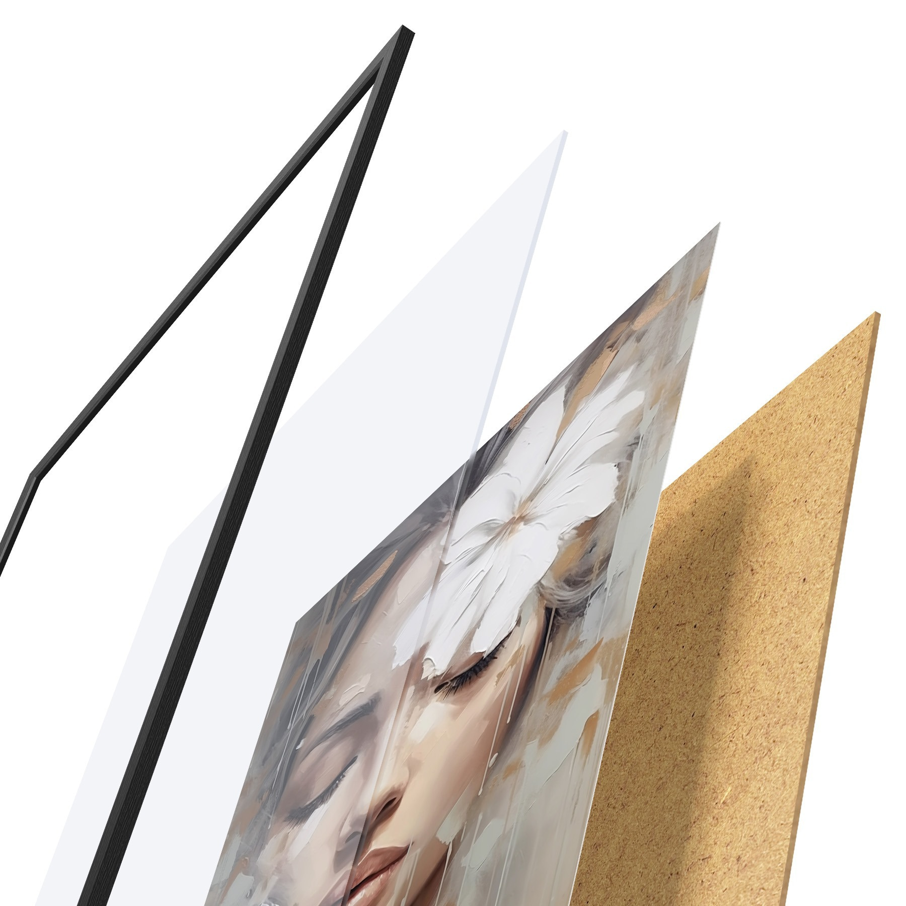 El póster consta de marco, plexiglás, imagen impresa y soporte de aglomerado. El póster puede colgarse inmediatamente en la pared gracias a los soportes de la parte posterior.