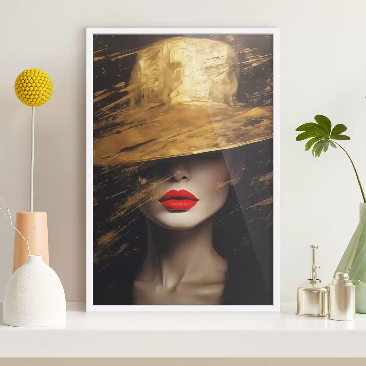 Poster Rostro femenino con pintalabios rojo bajo sombrero ancho Nr f44691