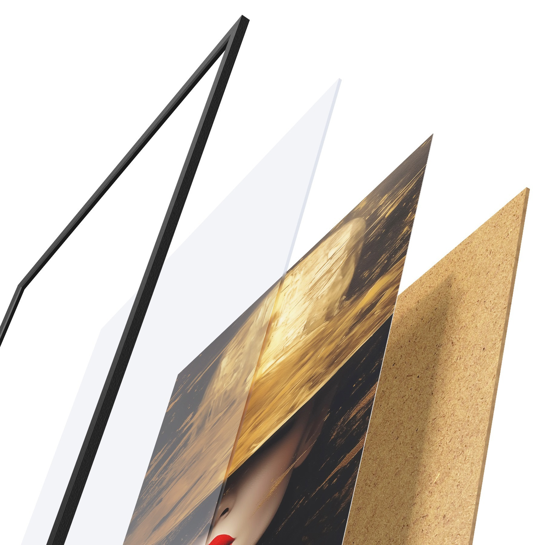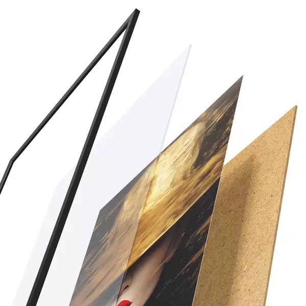 El póster consta de marco, plexiglás, imagen impresa y soporte de aglomerado. El póster puede colgarse inmediatamente en la pared gracias a los soportes de la parte posterior.