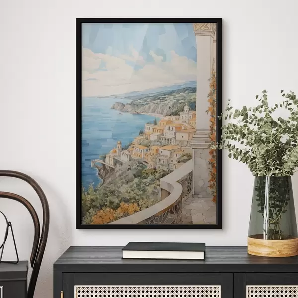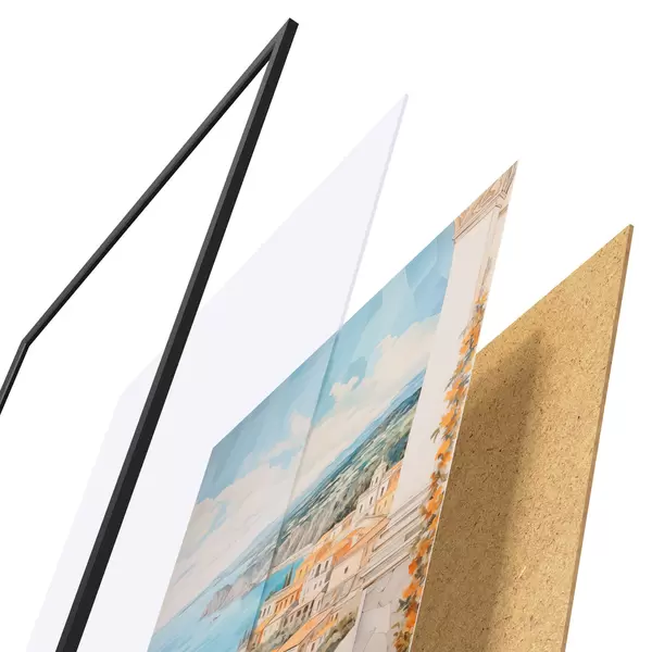 El póster consta de marco, plexiglás, imagen impresa y soporte de aglomerado. El póster puede colgarse inmediatamente en la pared gracias a los soportes de la parte posterior.