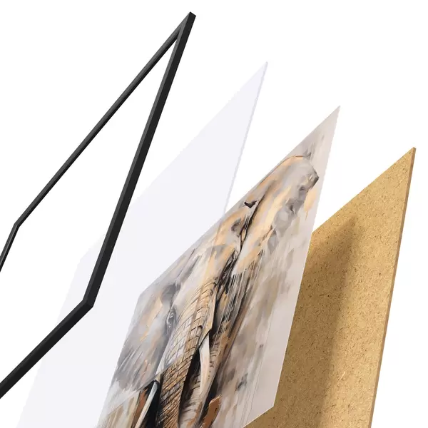 El póster consta de marco, plexiglás, imagen impresa y soporte de aglomerado. El póster puede colgarse inmediatamente en la pared gracias a los soportes de la parte posterior.