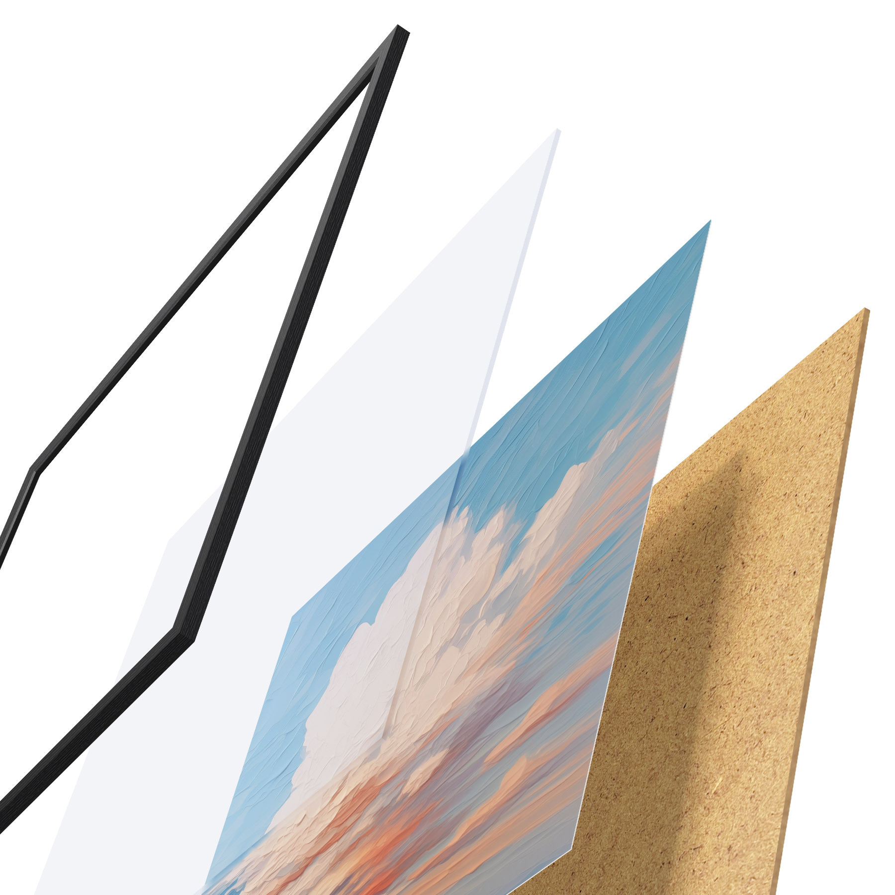 El póster consta de marco, plexiglás, imagen impresa y soporte de aglomerado. El póster puede colgarse inmediatamente en la pared gracias a los soportes de la parte posterior.