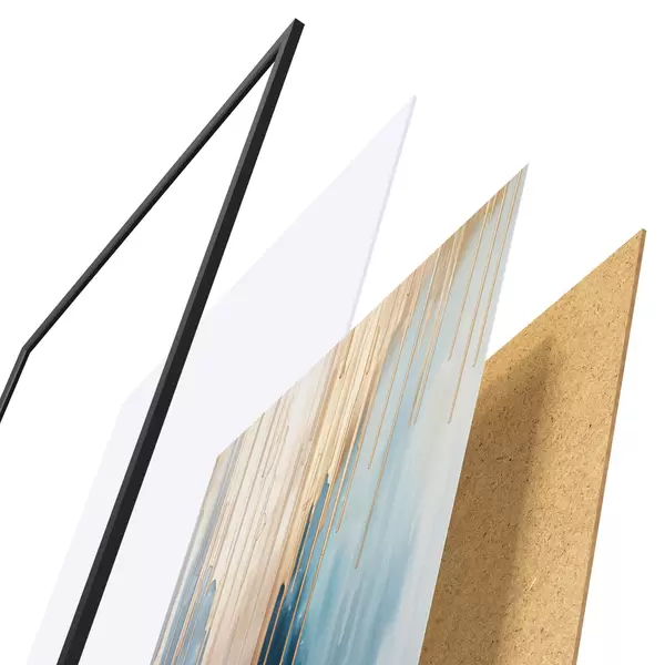 El póster consta de marco, plexiglás, imagen impresa y soporte de aglomerado. El póster puede colgarse inmediatamente en la pared gracias a los soportes de la parte posterior.