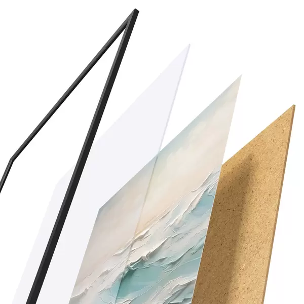 El póster consta de marco, plexiglás, imagen impresa y soporte de aglomerado. El póster puede colgarse inmediatamente en la pared gracias a los soportes de la parte posterior.