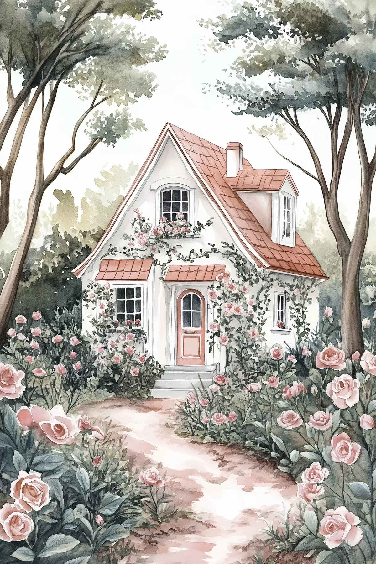 Poster Casa blanca con jardín de rosas en el bosque f44716