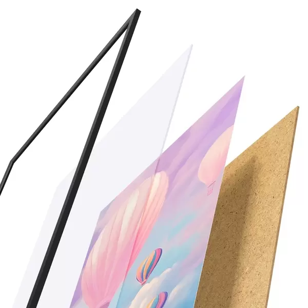 El póster consta de marco, plexiglás, imagen impresa y soporte de aglomerado. El póster puede colgarse inmediatamente en la pared gracias a los soportes de la parte posterior.