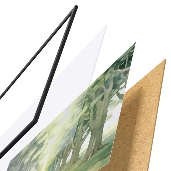 El póster consta de marco, plexiglás, imagen impresa y soporte de aglomerado. El póster puede colgarse inmediatamente en la pared gracias a los soportes de la parte posterior.