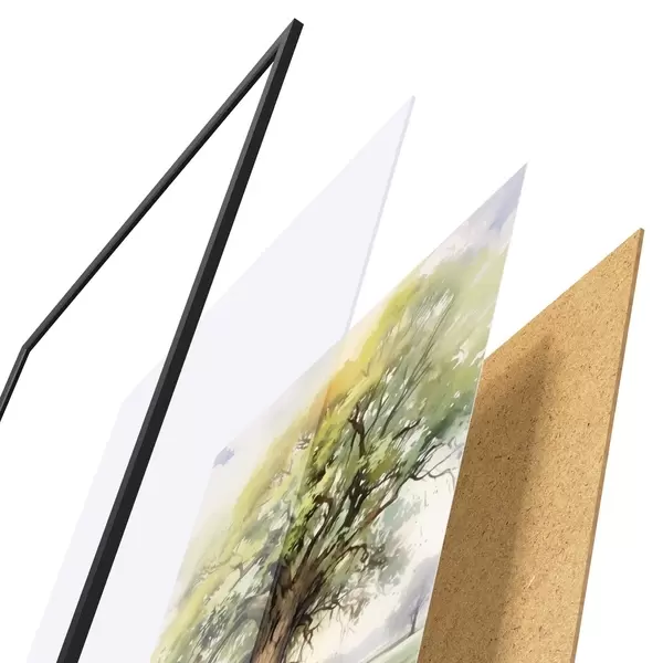 El póster consta de marco, plexiglás, imagen impresa y soporte de aglomerado. El póster puede colgarse inmediatamente en la pared gracias a los soportes de la parte posterior.
