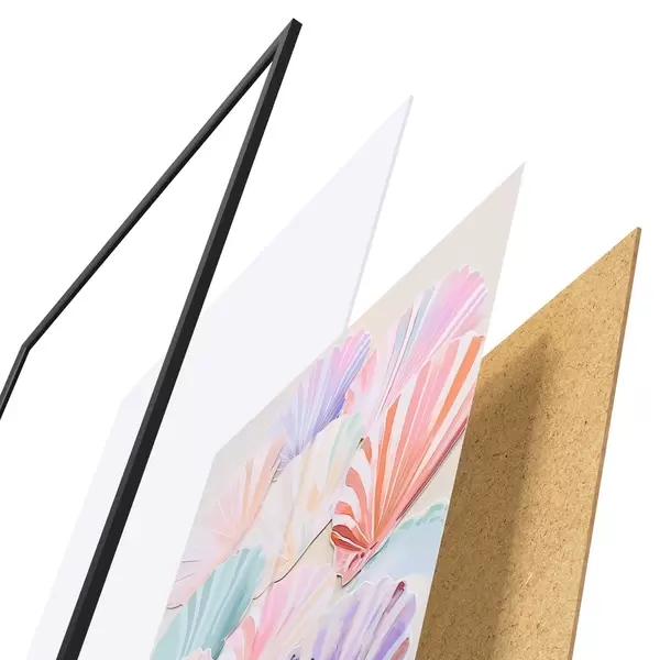 El póster consta de marco, plexiglás, imagen impresa y soporte de aglomerado. El póster puede colgarse inmediatamente en la pared gracias a los soportes de la parte posterior.