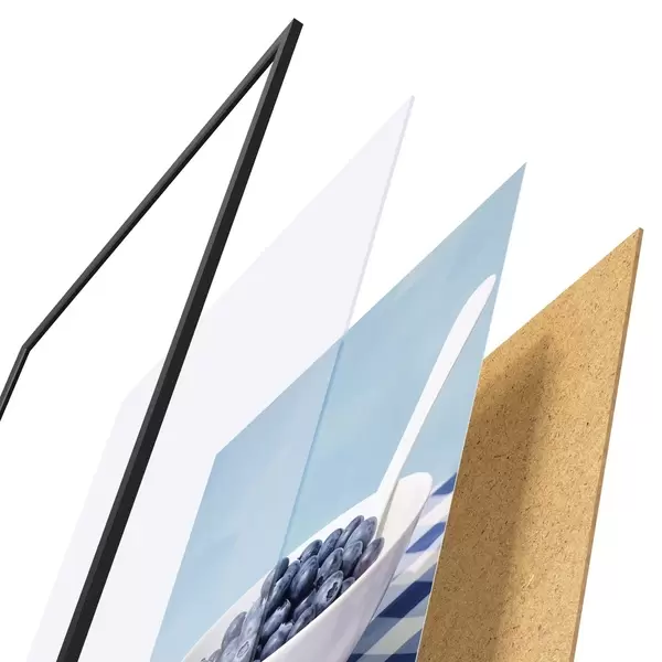 El póster consta de marco, plexiglás, imagen impresa y soporte de aglomerado. El póster puede colgarse inmediatamente en la pared gracias a los soportes de la parte posterior.