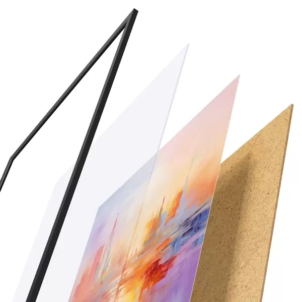 El póster consta de marco, plexiglás, imagen impresa y soporte de aglomerado. El póster puede colgarse inmediatamente en la pared gracias a los soportes de la parte posterior.