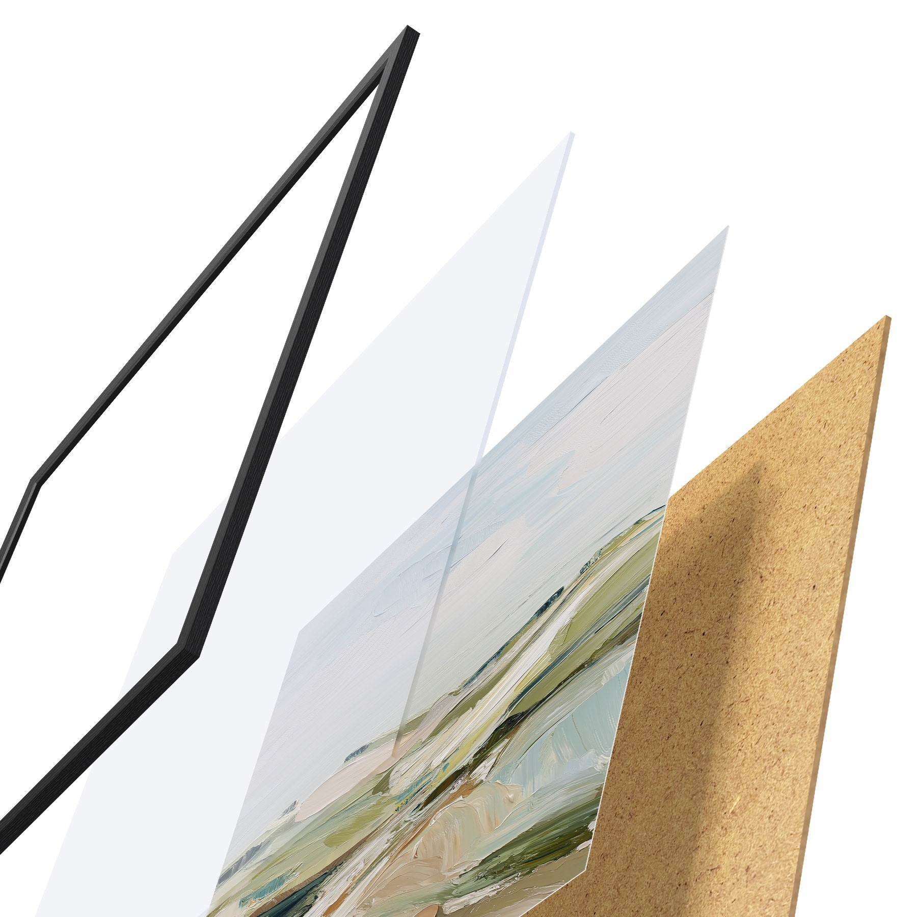 El póster consta de marco, plexiglás, imagen impresa y soporte de aglomerado. El póster puede colgarse inmediatamente en la pared gracias a los soportes de la parte posterior.
