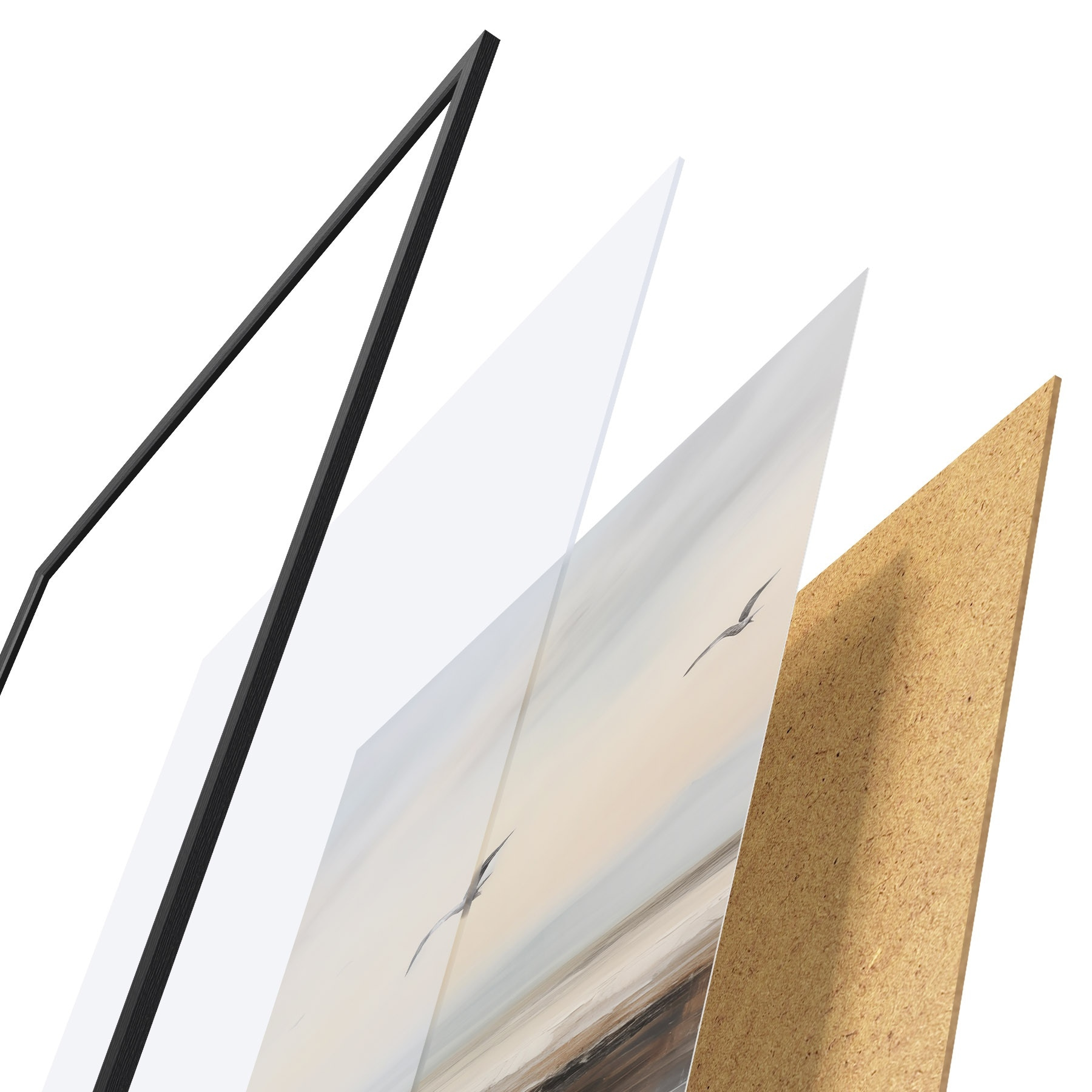El póster consta de marco, plexiglás, imagen impresa y soporte de aglomerado. El póster puede colgarse inmediatamente en la pared gracias a los soportes de la parte posterior.