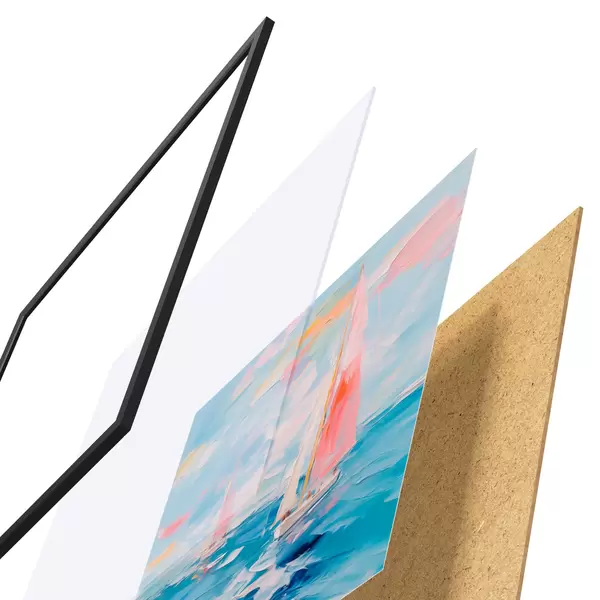 El póster consta de marco, plexiglás, imagen impresa y soporte de aglomerado. El póster puede colgarse inmediatamente en la pared gracias a los soportes de la parte posterior.