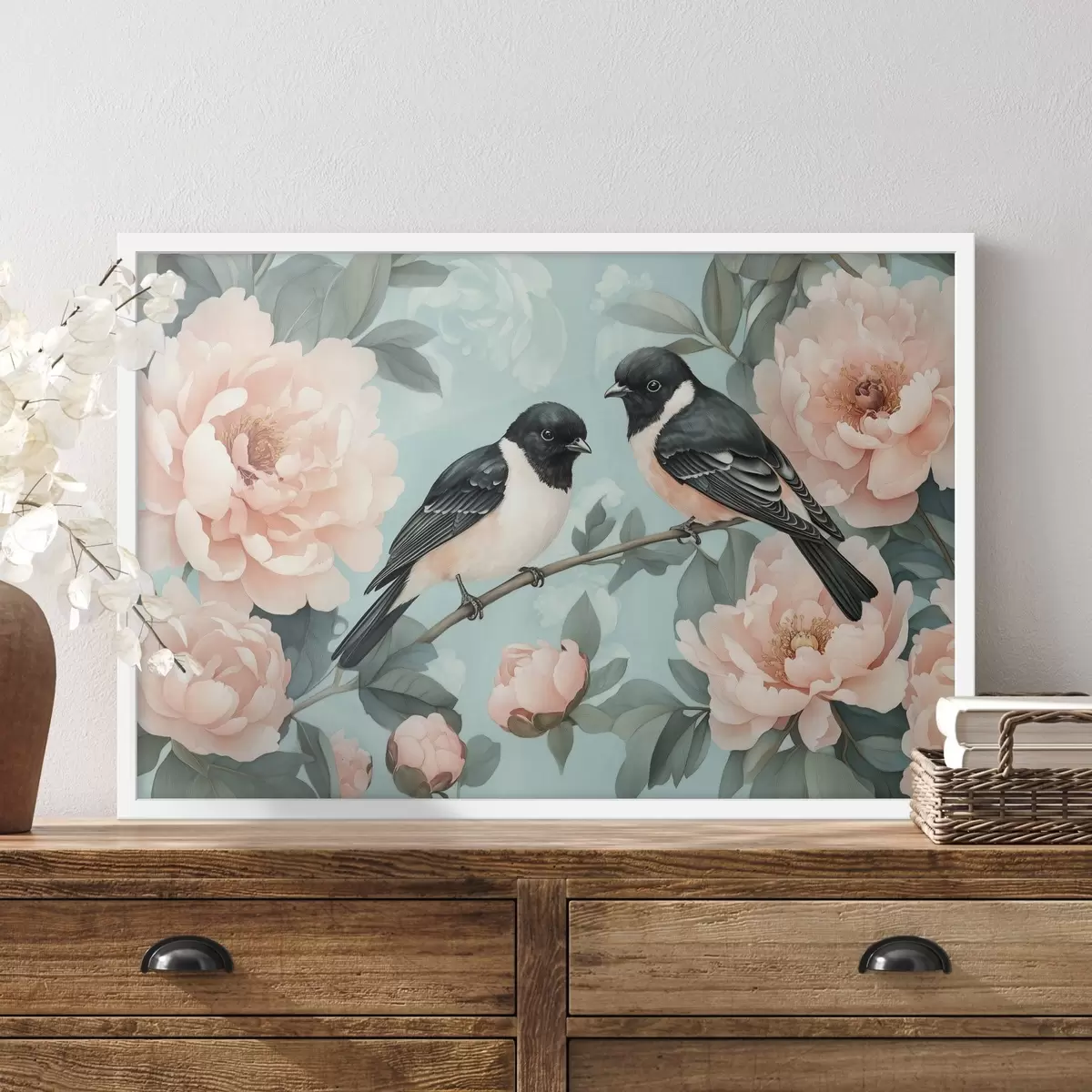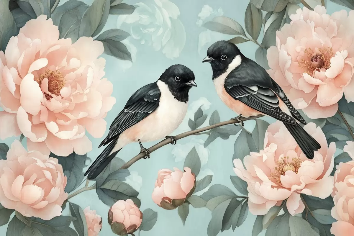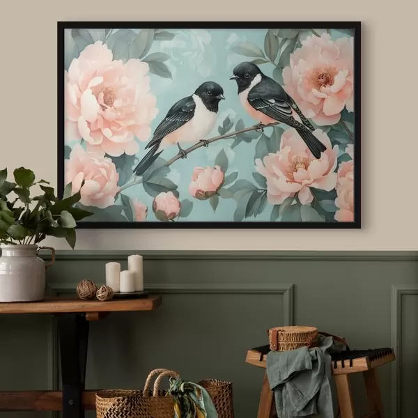 Poster Dos pájaros en la rama con peonías f44786