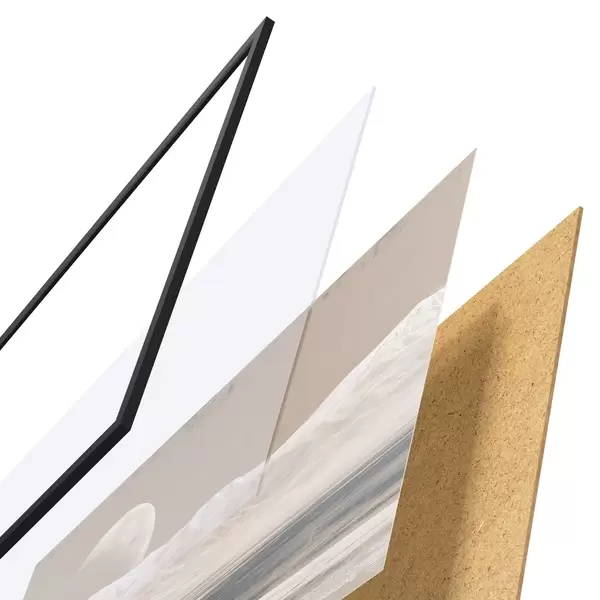 El póster consta de marco, plexiglás, imagen impresa y soporte de aglomerado. El póster puede colgarse inmediatamente en la pared gracias a los soportes de la parte posterior.