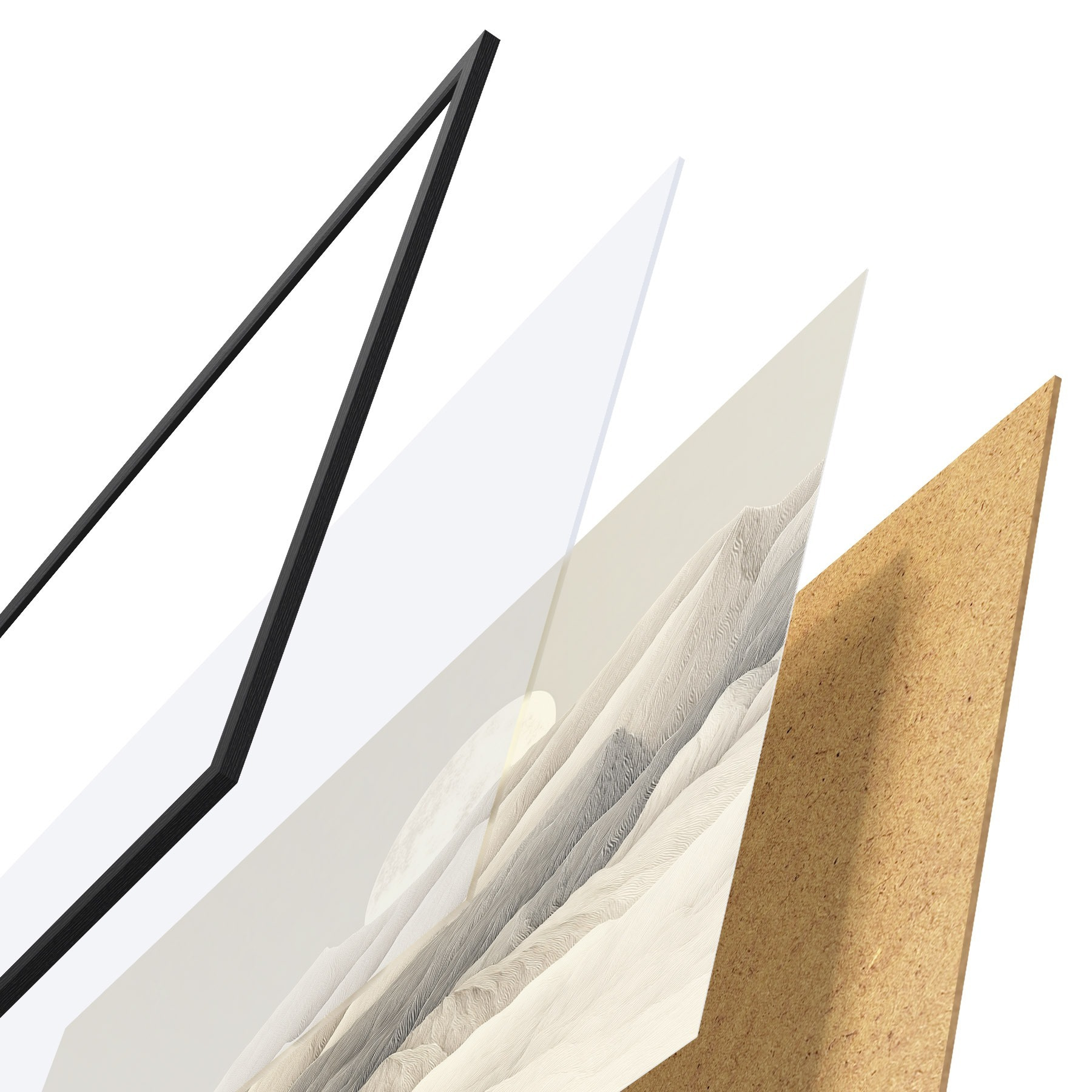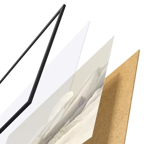 El póster consta de marco, plexiglás, imagen impresa y soporte de aglomerado. El póster puede colgarse inmediatamente en la pared gracias a los soportes de la parte posterior.