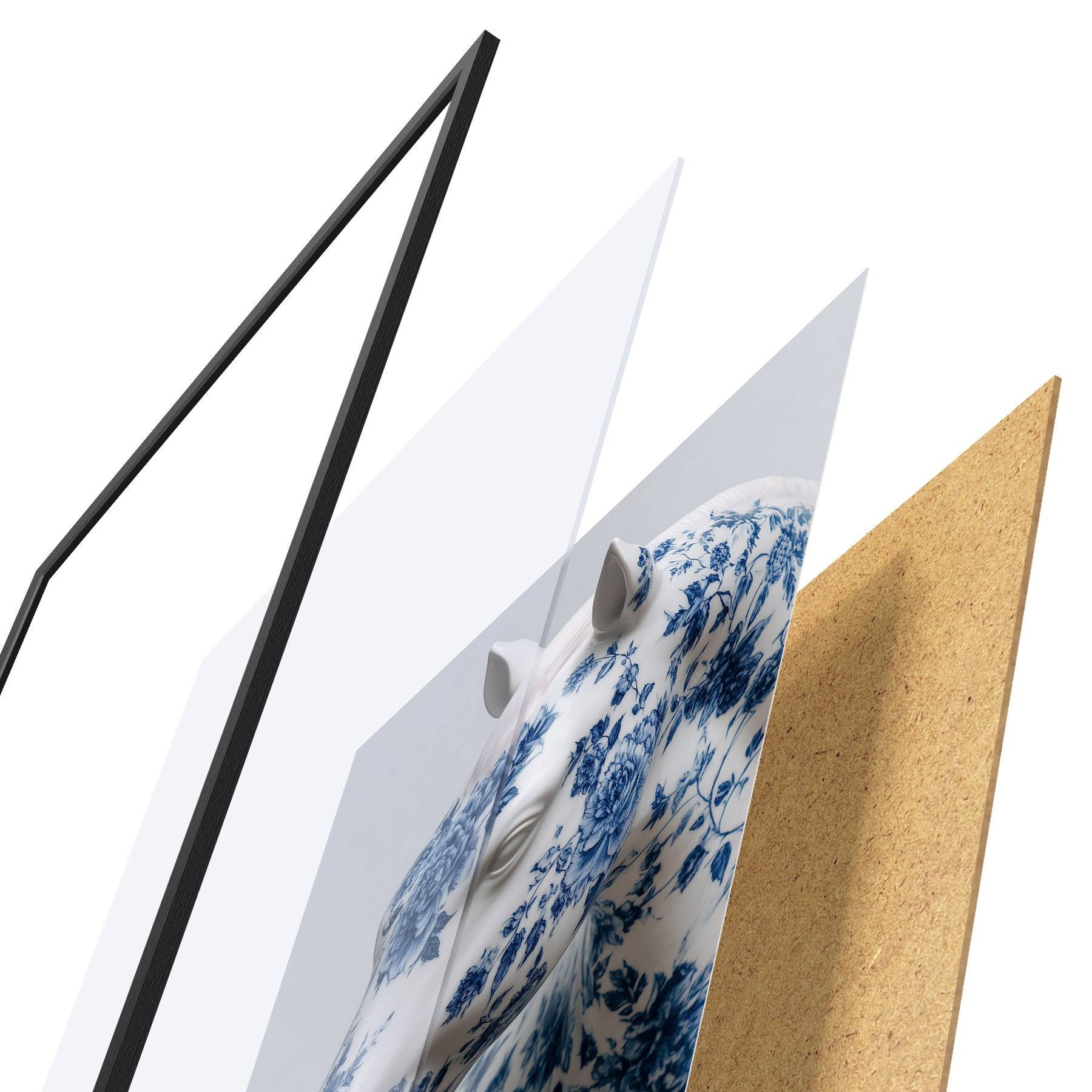El póster consta de marco, plexiglás, imagen impresa y soporte de aglomerado. El póster puede colgarse inmediatamente en la pared gracias a los soportes de la parte posterior.