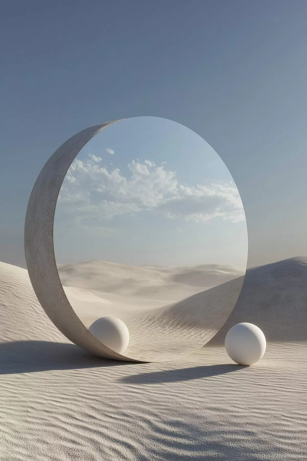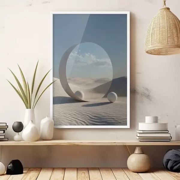 Poster Surrealista paisaje desértico con un espejo redondo que refleja el cielo y la luna Nr f44792