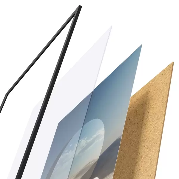 El póster consta de marco, plexiglás, imagen impresa y soporte de aglomerado. El póster puede colgarse inmediatamente en la pared gracias a los soportes de la parte posterior.