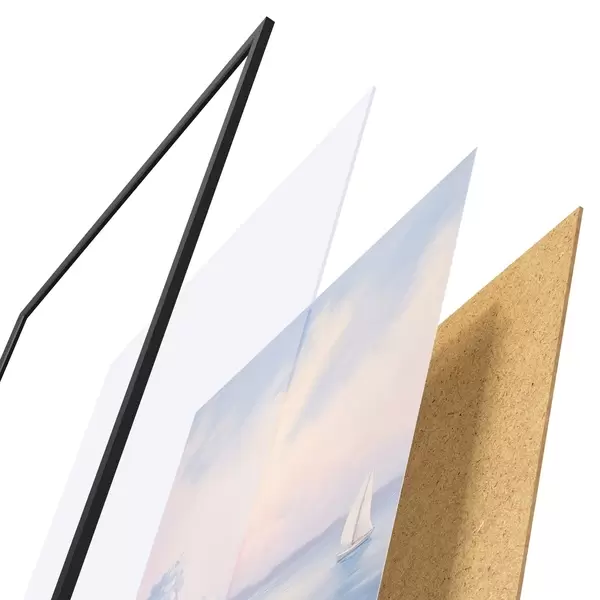El póster consta de marco, plexiglás, imagen impresa y soporte de aglomerado. El póster puede colgarse inmediatamente en la pared gracias a los soportes de la parte posterior.