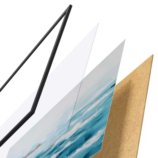 El póster consta de marco, plexiglás, imagen impresa y soporte de aglomerado. El póster puede colgarse inmediatamente en la pared gracias a los soportes de la parte posterior.