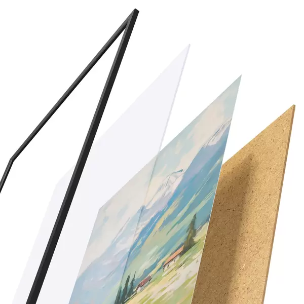 El póster consta de marco, plexiglás, imagen impresa y soporte de aglomerado. El póster puede colgarse inmediatamente en la pared gracias a los soportes de la parte posterior.