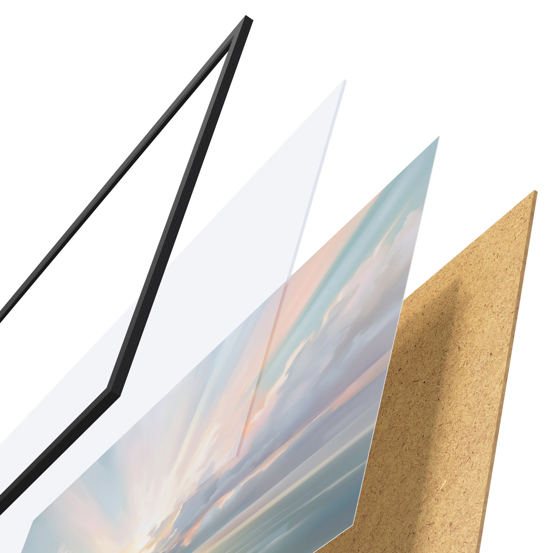 El póster consta de marco, plexiglás, imagen impresa y soporte de aglomerado. El póster puede colgarse inmediatamente en la pared gracias a los soportes de la parte posterior.