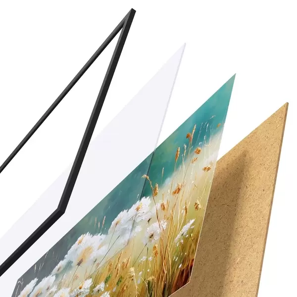 El póster consta de marco, plexiglás, imagen impresa y soporte de aglomerado. El póster puede colgarse inmediatamente en la pared gracias a los soportes de la parte posterior.
