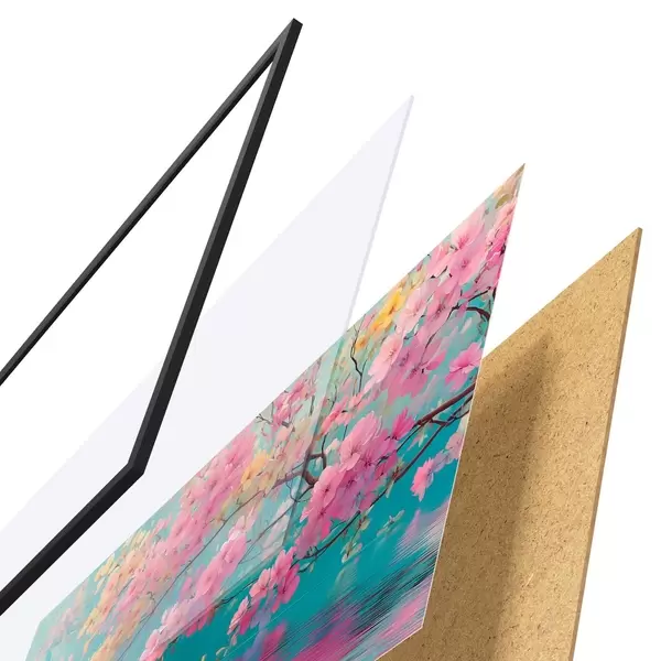 El póster consta de marco, plexiglás, imagen impresa y soporte de aglomerado. El póster puede colgarse inmediatamente en la pared gracias a los soportes de la parte posterior.